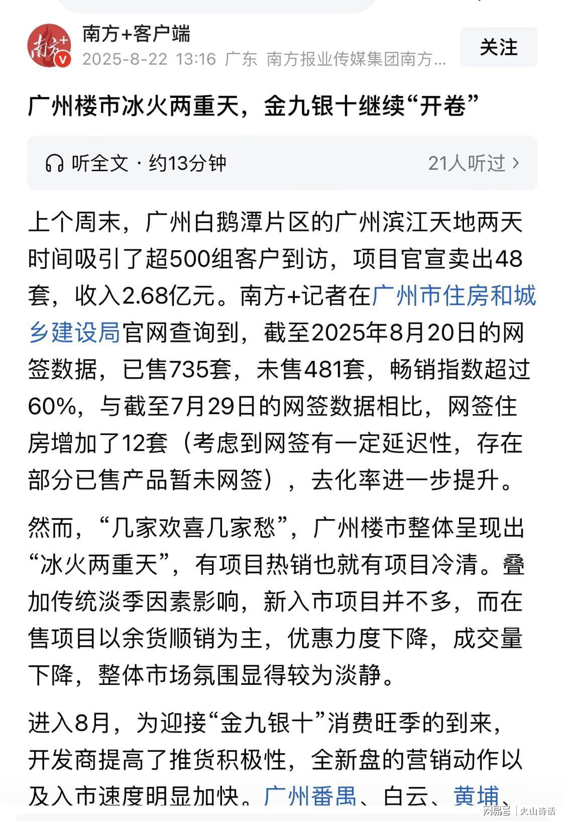 据媒体最新报道,上个周末,广州白鹅潭片区的广州滨江天地两天时间吸引了超500组客户到访,项目官宣卖出48套,收入2.68亿元。南方+记者在广州市住房和城乡建设局官网查询到,截至2025年8月20日的网签数据,已售735套,未售481套,畅销指数超过60%,与截至7月29日的网签数据相比,网签住房增加了12套(考虑到网签有一定延迟性,存在部分已售产品暂未网签),去化率进一步提升。