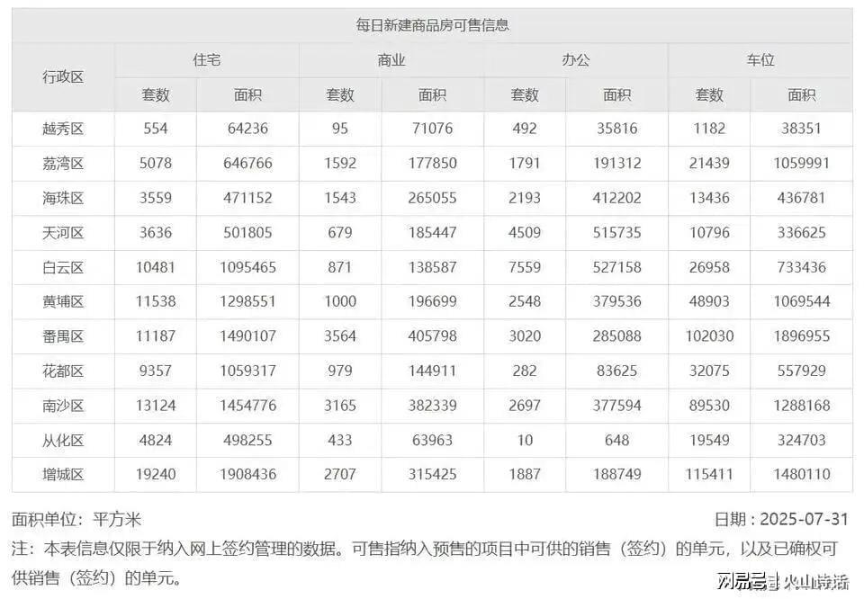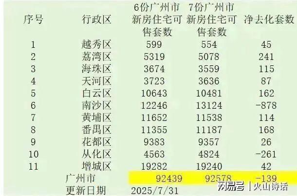 我们再来看看广州7月最新数据已经出炉。7月广州市住宅新房网签量4787套,同比下跌了6.76%。7月份广州新房住宅可售92578套,净去化增加139套,库存增加主要是南沙区和从化区增各加了878套和261套。