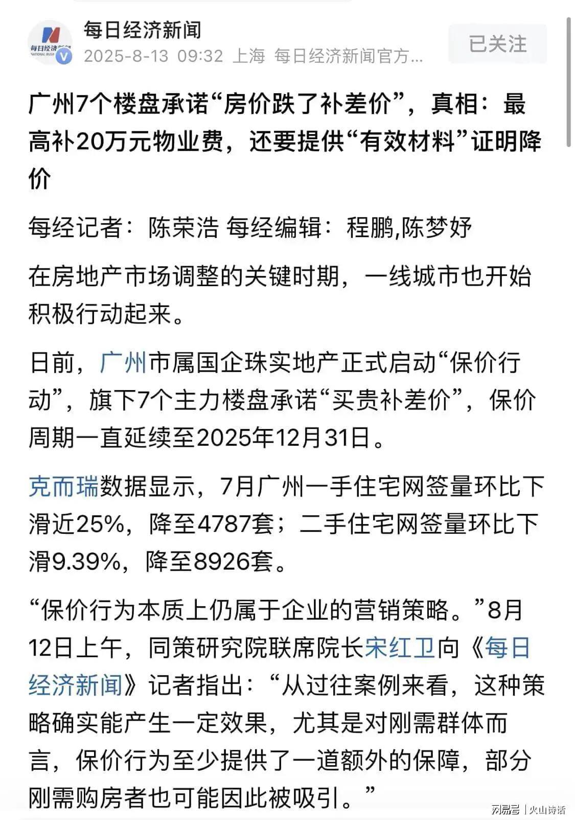 报道称,日前,广州市属国企珠实地产正式启动“保价行动”,旗下7个主力楼盘承诺“买贵补差价”,保价周期一直延续至2025年12月31日。