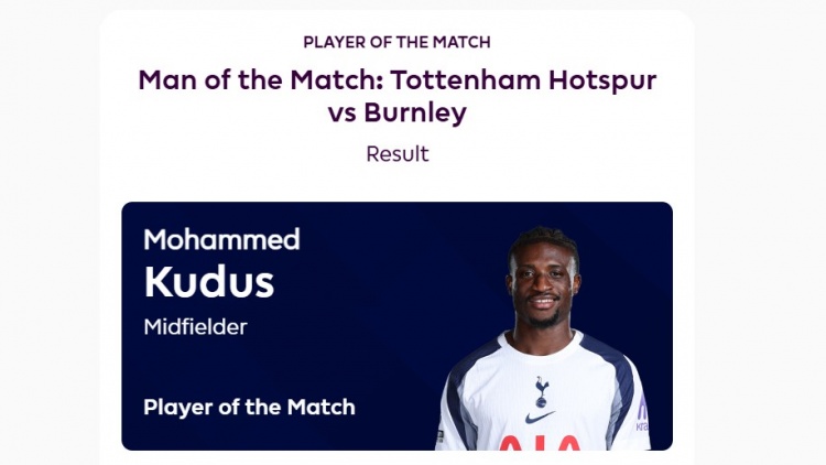 此役,热刺夏窗新援库杜斯首发出战,在第85分钟被替换下场,送出两记助攻,球员以43%的得票率当选英超官方全场最佳球员。